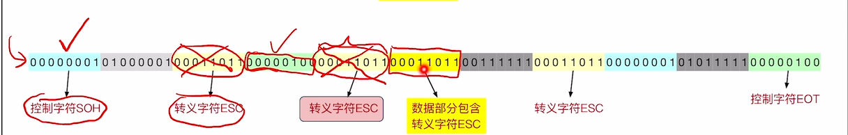 - 引入转义字符(Escape Character,1CH)来标识中间数据中出现的控制字符,当接受方收到数据时,由于已知帧的界限,在界限之内看到ESC,就可以直接去掉,得到真正的数据