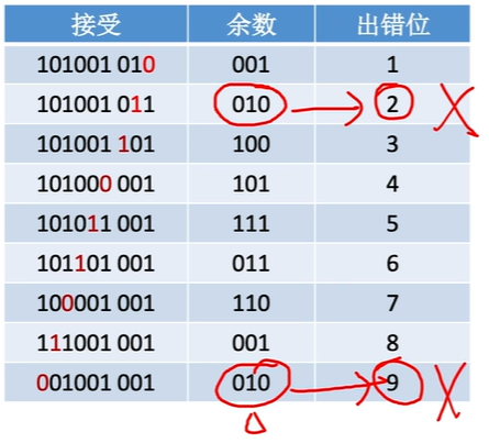 - 出错后的余数存在一定的规律,但是并不一一对应,可以看到出错位数2和位数9余数相同,所以不一定能纠错,除非余数的位数能表示的位数大于CRC码的位数