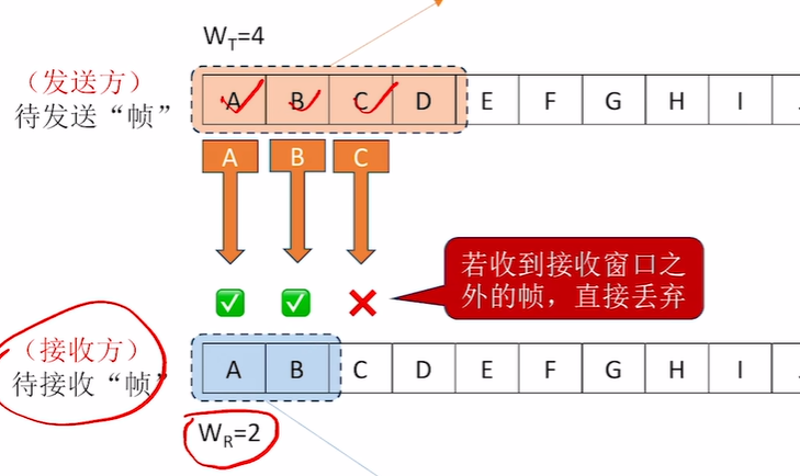 - 如果是接收方的确认帧没发送成功,接收方其实会下移一位窗口