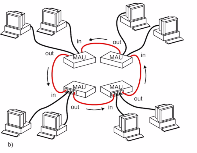 - 集线器连接时为总线(逻辑)星型(物理),半双工