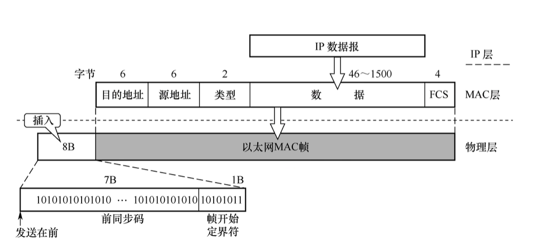 - 类型是 网络层协议 16bit,标明当前发送数据使用的是网络层中的哪个协议(在IEEE中这个部分表明了数据的长度,因为IEEE的MAC层不直接服务网络层,上面还有一个LLC层)