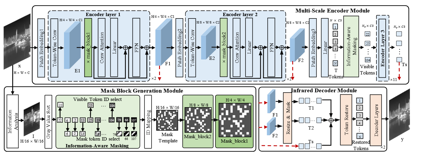 同时,自监督模型中传统的掩码策略不适用于红外的弱纹理,弱细节图像,不利于恢复甚至重建图像细节