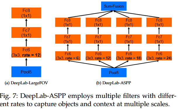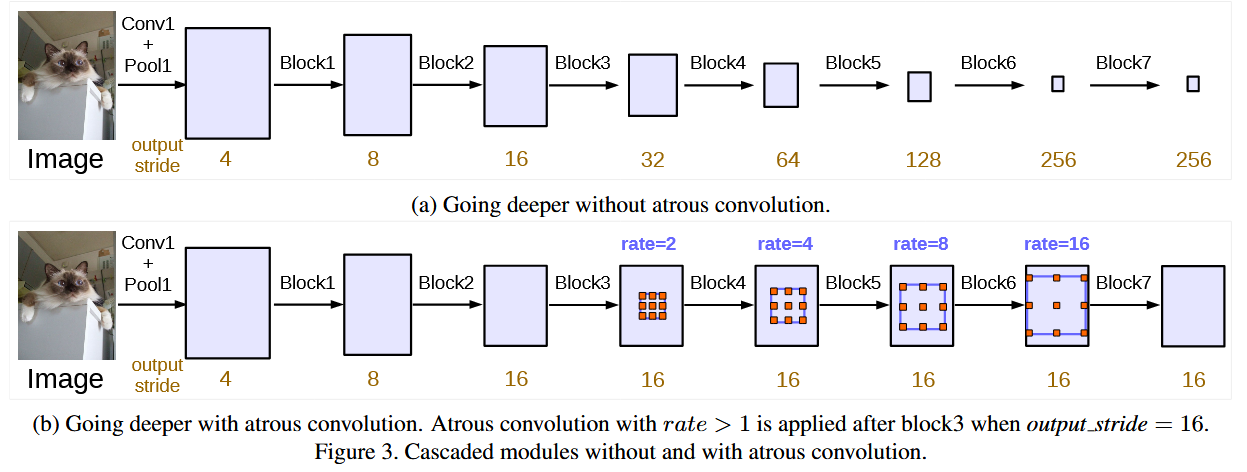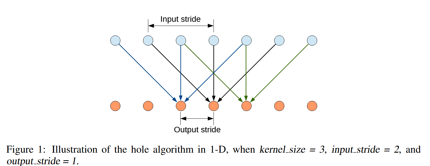 这样就实现了扩大感受野,但是分辨率不降低,在文中的实现其实有些设计,并没有用空洞卷积完全代替下采样,依旧保留了部分像素变小的操作,目的应是保留这些分类DCNN对高层次语义的提取能力,需要一定的下采样