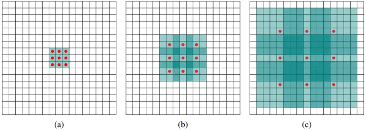 - b图空洞率为2,理解上就是对于一个7patch,只有9个红色的点有效,其余都是0权重