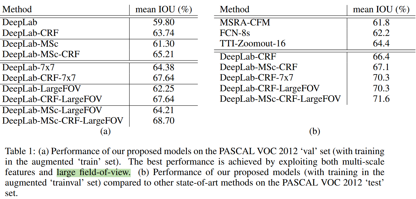 最后实验验证,CRF效果很好,多尺度也还行,空洞卷积实现的广视野可以有效降低参数量,同时提高精度