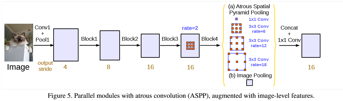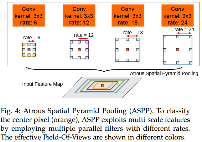 - 空洞卷积优化,结合多尺度信息,提出ASPP