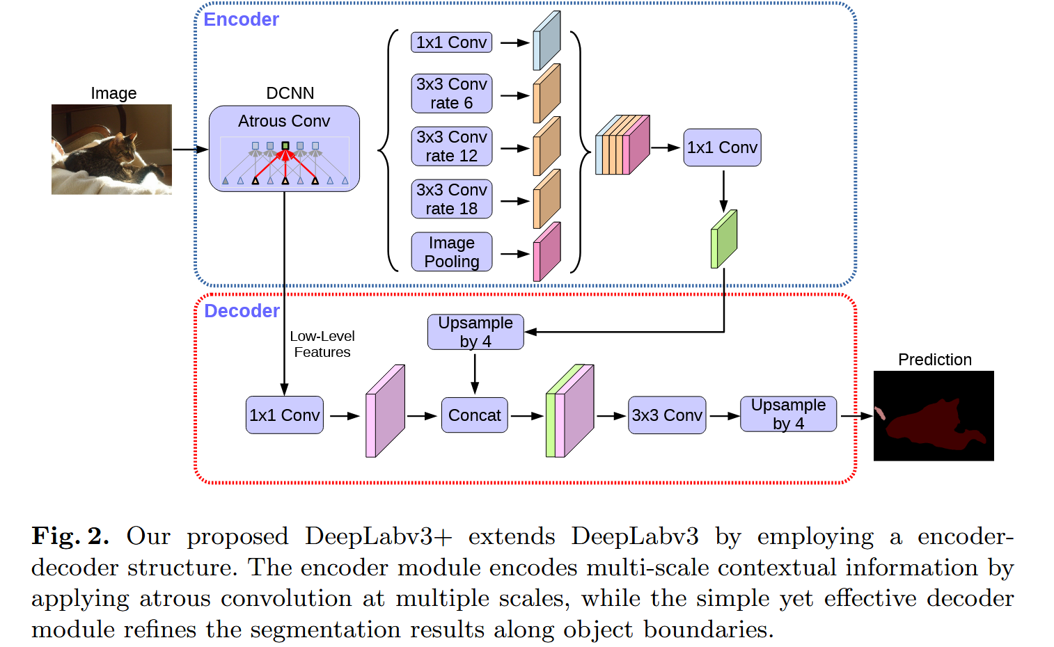 所以设计了一个由DeepLab v3来做Encoder,增加一个简单的Decoder来完成部分上采样的方法,以此减少空洞卷积的使用,同时保证细节信息的学习