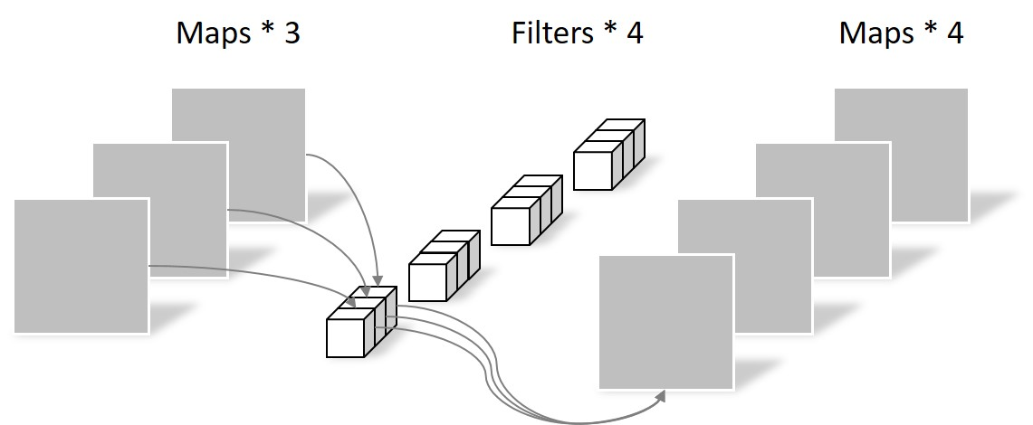 普通卷积,每个核对应输入通道数,核数对应输出通道数,将输入通道经过核后形成一张单通道图,多核组成多通道,参数量