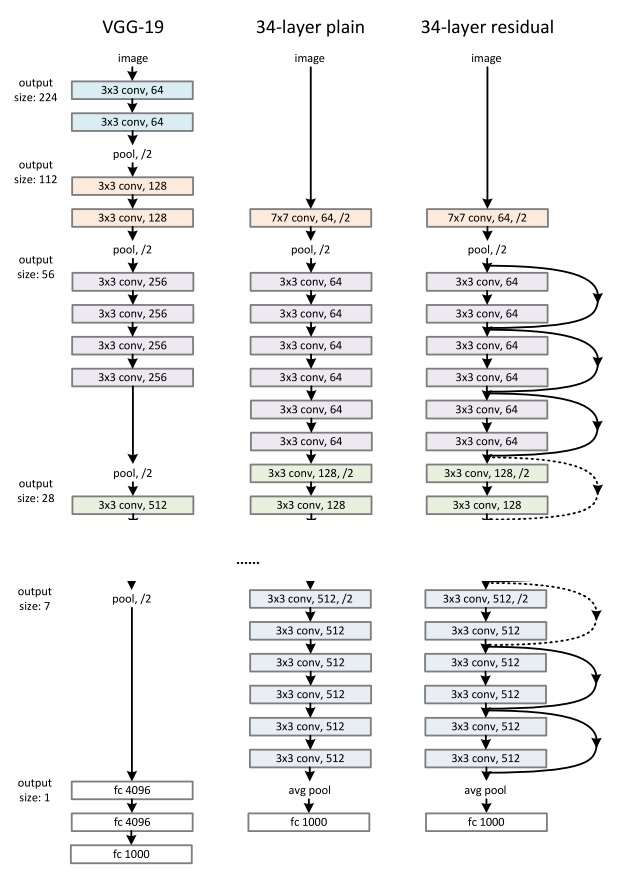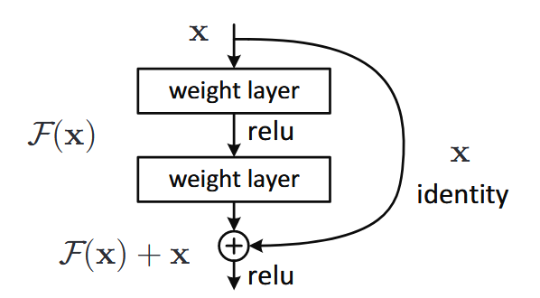 其中x是之前的输出,F代表层学习,之前的输出以直接逐元素相加的方式添加到当前层之中,维度不同用0填充,添加之后再进行激活,例如上图的学习为