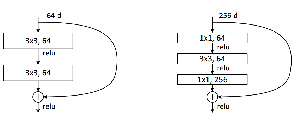 其中,左边是普通的卷积,用于浅层模型(18-34),右边是瓶颈层,使用1卷积来降低计算量,用于深层模型(50以上)