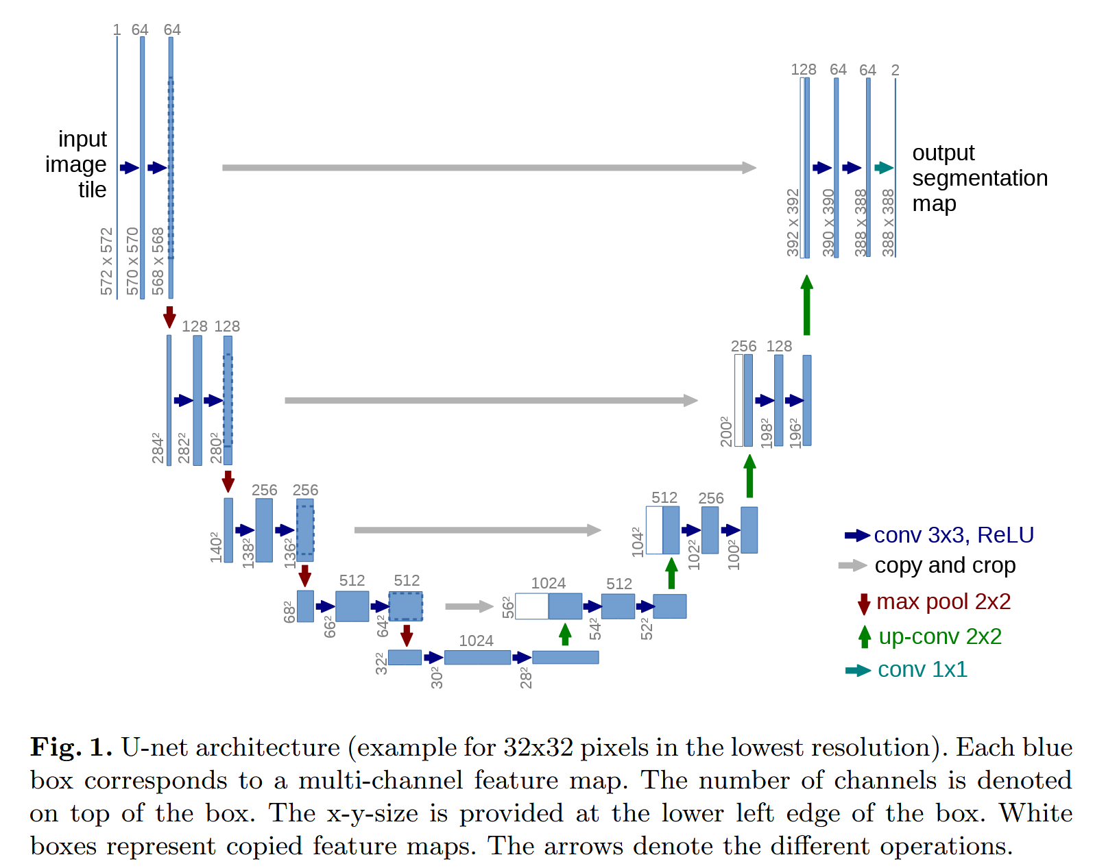 编码器往下逐层学习,其中间结果为解码器提供细节信息,裁剪是因为每次卷积都会在边界引入无用信息