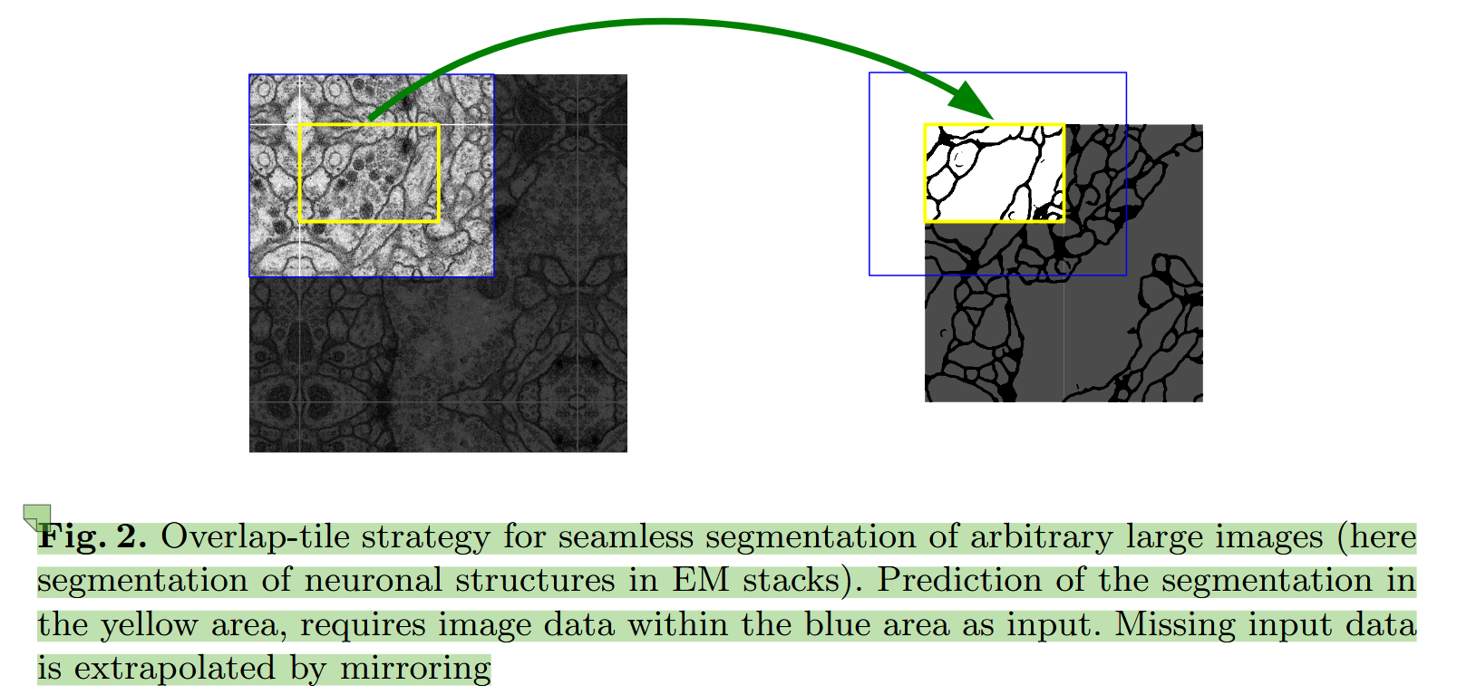 右边是原图(有效的图),左侧是镜像拼接之后的图片,使用大卷积核时,可以扫过拼接的镜像部分,得到这部分上下文(平移不变性),用于预测